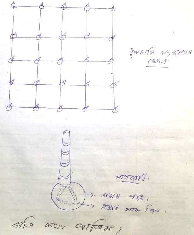 Once digging is done, the next step is to purify the water body. And for that, a large copper plate is placed in the middle of the pond at its bottom. (It is said, drinking water in a copper container is beneficial for health). Some mercury (rah/ para/parad) is poured into the plate and a pole is fixed on it. In addition to rah, some gravel stones and lumps of charcoal were also placed around the pole (nagmari) to cleanse the water body. Interestingly, this rah was extracted from the bel leaves. And as rah is applied in the water body, some ponds are named as rahdhala, Rahkhowa, etc. Another significant aspect of these ponds was that water level remained almost intact in all seasons. Till today a few of such ponds constructed during the Ahom period exist in some parts of upper Assam. A nagmari can be seen in the Hatigarh pond near Jorhat even now. It is believed that nagamari is named after Nag or Nagini, which emerged from Agni (fire), the celestial god of energy. The nagmari is made of a wooden pole with an iron plate fixed on its top.