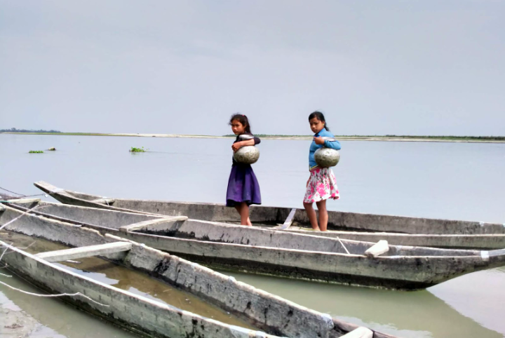 The bend of the river is ever approaching the heart of their village. As erosion and the fear of losing home are so profoundly rooted in their minds, no one cares about the importance of safe drinking water. No one cares that their water has not been tested and treated. On the other side of the river, over the horizon tall grass, buffaloes, cranes, and ruddy shelducks – all sharing the same landscape – the sun is setting, spraying the remaining spectrum of colours. Maybe 10 or 20 years from now, that space will be occupied by these land lost people.