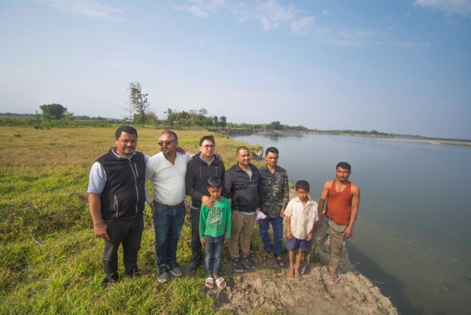 Post Script: It’s been several months now since the water talk took place. In between these months, that bend, where we stood for a photo, changed its contour. The river ate up more than 1.3 km and moved close to the Karak tree that still stands proudly in the middle of Mudoibeel village.